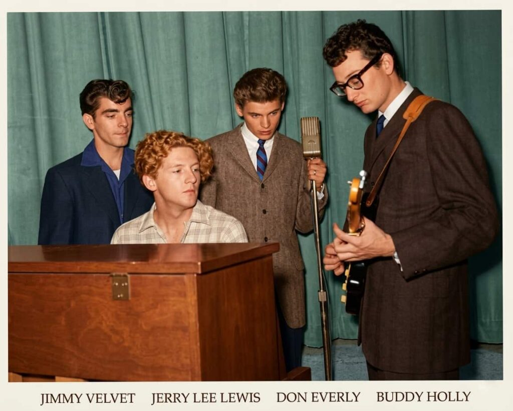 What makes this moment extraordinary is not spectacle, but intimacy. Buddy Holly, with his unmistakable glasses and quiet intensity, stands not as a star, but as a student of sound curious, attentive, always searching. Nearby, Jerry Lee Lewis sits at the piano, already carrying that restless fire that would soon shake stages across America. Behind them, Don Everly, one half of a harmony that would influence generations, leans in with the focus of someone absorbing every note. And Jimmy Velvet, often less spoken of, represents the countless voices that helped shape the texture of that era.
