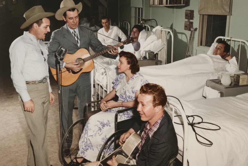 The room was a far cry from the bright lights of the Grand Ole Opry. Rows of white beds lined the walls, their occupants a mix of young men in uniform and civilians in plain hospital gowns. The faint smell of antiseptic lingered in the air, mingling with the quiet hum of medical equipment. Some patients were propped up on pillows, others confined to wheelchairs.
