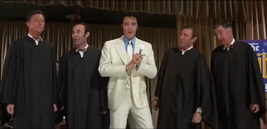 The 1969 film scene is special precisely because it strips away some of the cinematic artifice. It presents Elvis on stage, backed by real musicians—a rarity in his later filmography. The last time his movie performance featured real instrumentalists was five years earlier in Viva Las Vegas. In this instance, the backing singers were The Mellomen, a distinguished vocal group Elvis had recorded with previously. They play “The Bible Singers” in the film, a part of the traveling Chautauqua troupe led by Elvis’s character, Walter Hale.