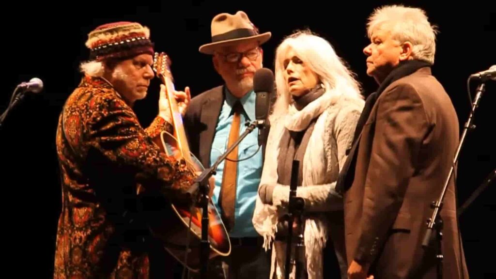 Musically, the performance is stripped of all artifice. There are no drums to drive the beat, no electric guitars to hide behind. It is performed a cappella, a choice that demands absolute vulnerability. Emmylou Harris, supported by her bandmates in tight, four-part harmony, creates a “high lonesome sound” that feels ancient, as if the wind itself is singing through the Appalachian mountains. The harmonies are close, tense, and resolve with a beauty that brings tears to the eyes. This style of singing forces the listener to focus entirely on the words and the emotion behind them. It is a reminder of a time when music was made on front porches and in church pews, driven solely by the need to express what the heart could no longer contain.
